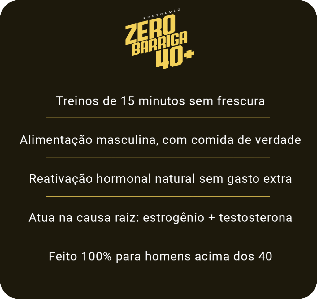 O Protocolo Zero Barriga 40+ é o lugar onde eu reuni tudo o que funcionou comigo e com mais de 35 mil homens reais, que estavam perdendo o controle do corpo e da masculinidade — e viraram o jogo sem precisar se matar na academia, nem cortar tudo que gostam de comer.